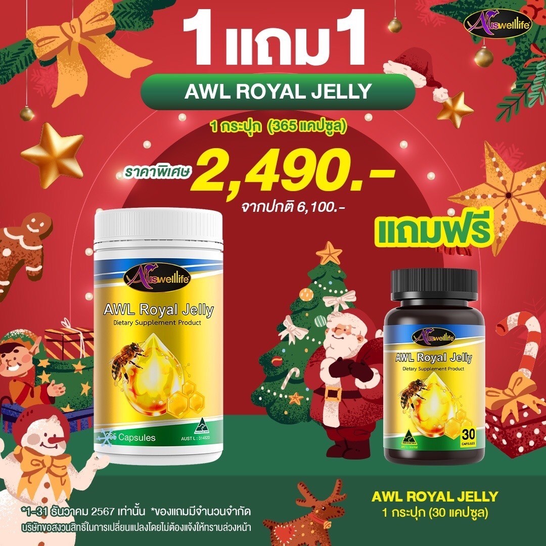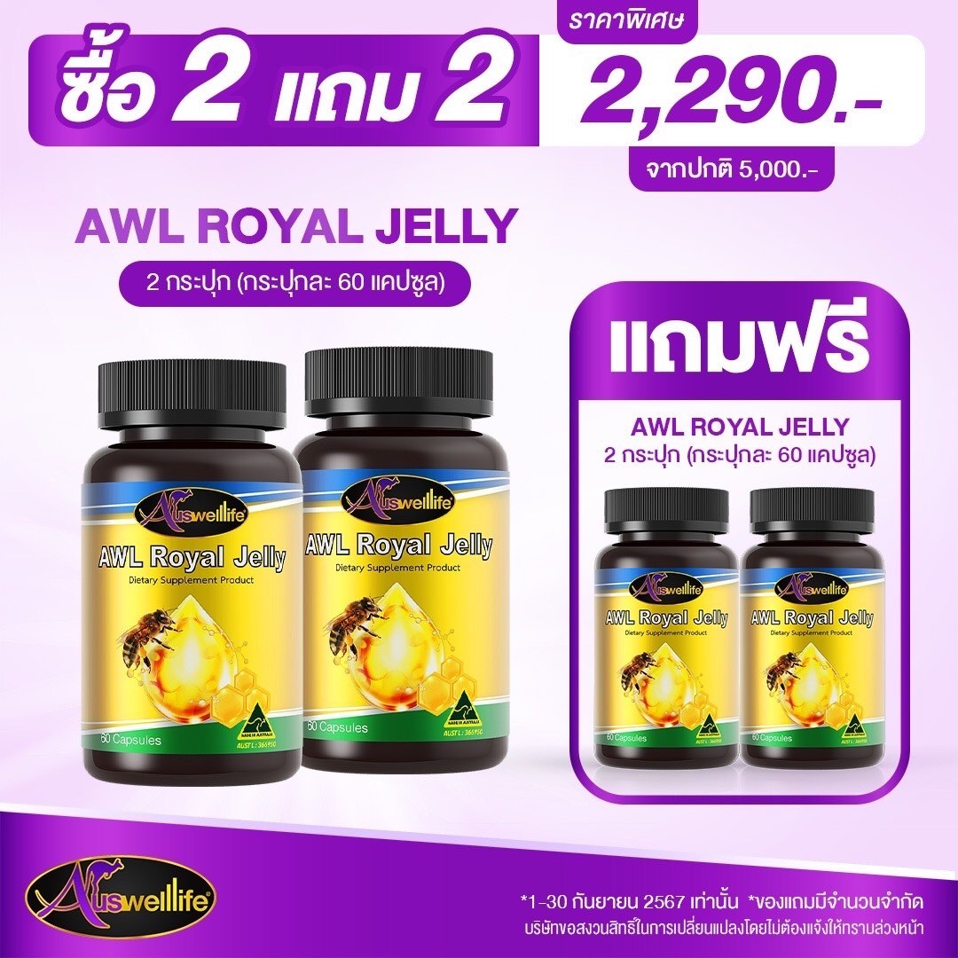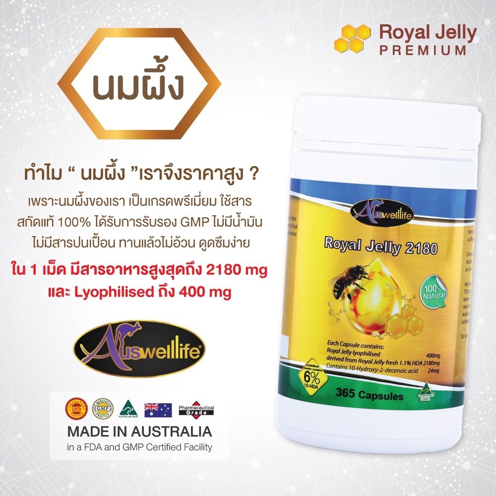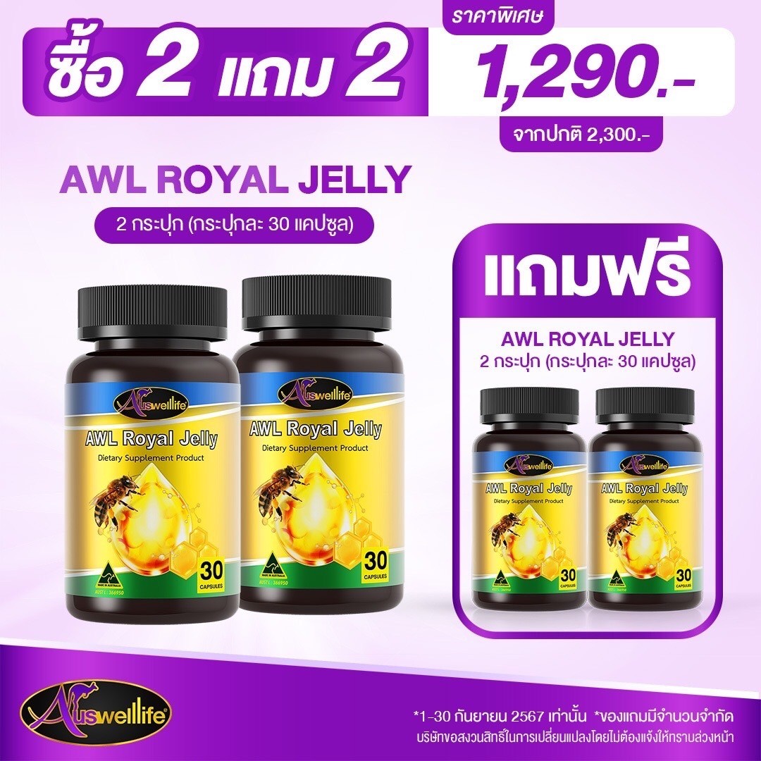 Auswelllife Royal Jelly นมผึ้งคุณภาพสูง มีความเข้มข้นสูง คืนความอ่อนเยาว์บำรุงและฟื้นฟูร่างกาย เหมาะสำหรับผู้ที่ต้องการดูแลผิวพรรณ รักษาฟื้นฟูผิวที่มีปัญหา ลดริ้วรอย ลดการอักเสบ สิว ให้กลับมาสวยใส อ่อนเยาว์