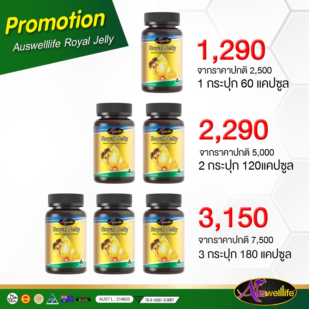 Auswelllife Royal Jelly นมผึ้งคุณภาพสูง มีความเข้มข้นสูง คืนความอ่อนเยาว์บำรุงและฟื้นฟูร่างกาย เหมาะสำหรับผู้ที่ต้องการดูแลผิวพรรณ รักษาฟื้นฟูผิวที่มีปัญหา ลดริ้วรอย ลดการอักเสบ สิว ให้กลับมาสวยใส อ่อนเยาว์
