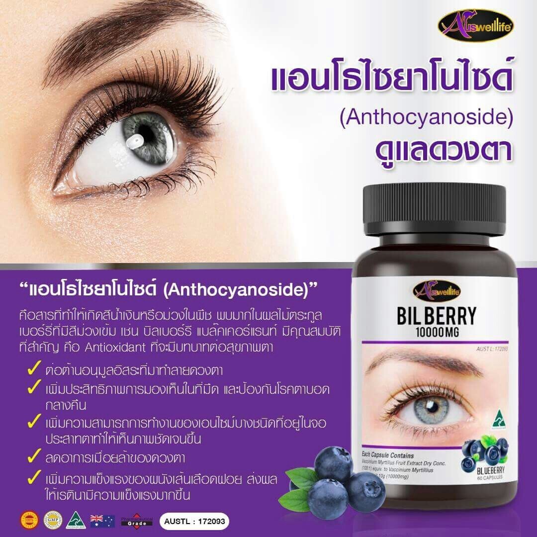 Auswelllife Bilberry 1000 mg. อาหารเสริมที่ช่วยเพิ่มสมรรถภาพในการมองเห็น บำรุงสายตาด้วยวิตามินจากธรรมชาติเข้มข้นที่สุด ช่วยให้อาการทางสายตาดีขึ้นชัดเจน พร้อม Lutine ช่วยตัดแสงสีฟ้าจากหน้าจอสำหรับคนที่ชอบใช้คอม จ้องมือถือทั้งวันทั้งคืน