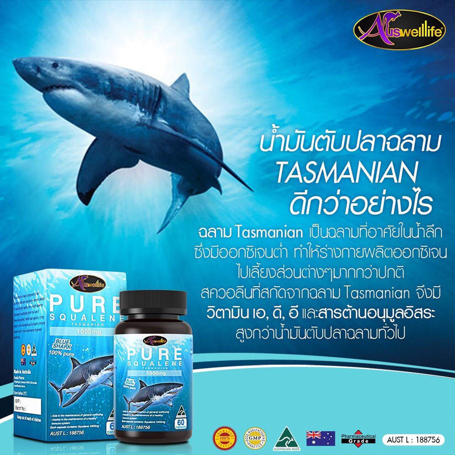 Auswelllife Pure Squalene เป็นน้ำมันสกัดบริสุทธิ์ที่สกัดจากตับปลาฉลาม Tasmanian โดยปลาฉลามพันธุ์นี้อยู่ในน้ำลึก มีออกซิเจนต่ำ จึงทำให้มีการผลิตออกซิเจนหล่อเลี้ยงร่างกายในปริมาณสูงกว่าปลาฉลามน้ำตื้น ซึ่งมี Vitamin A, D, E และกรดไขมันกลุ่มที่เป็นสารต้านอนุมูลอิสระสูง